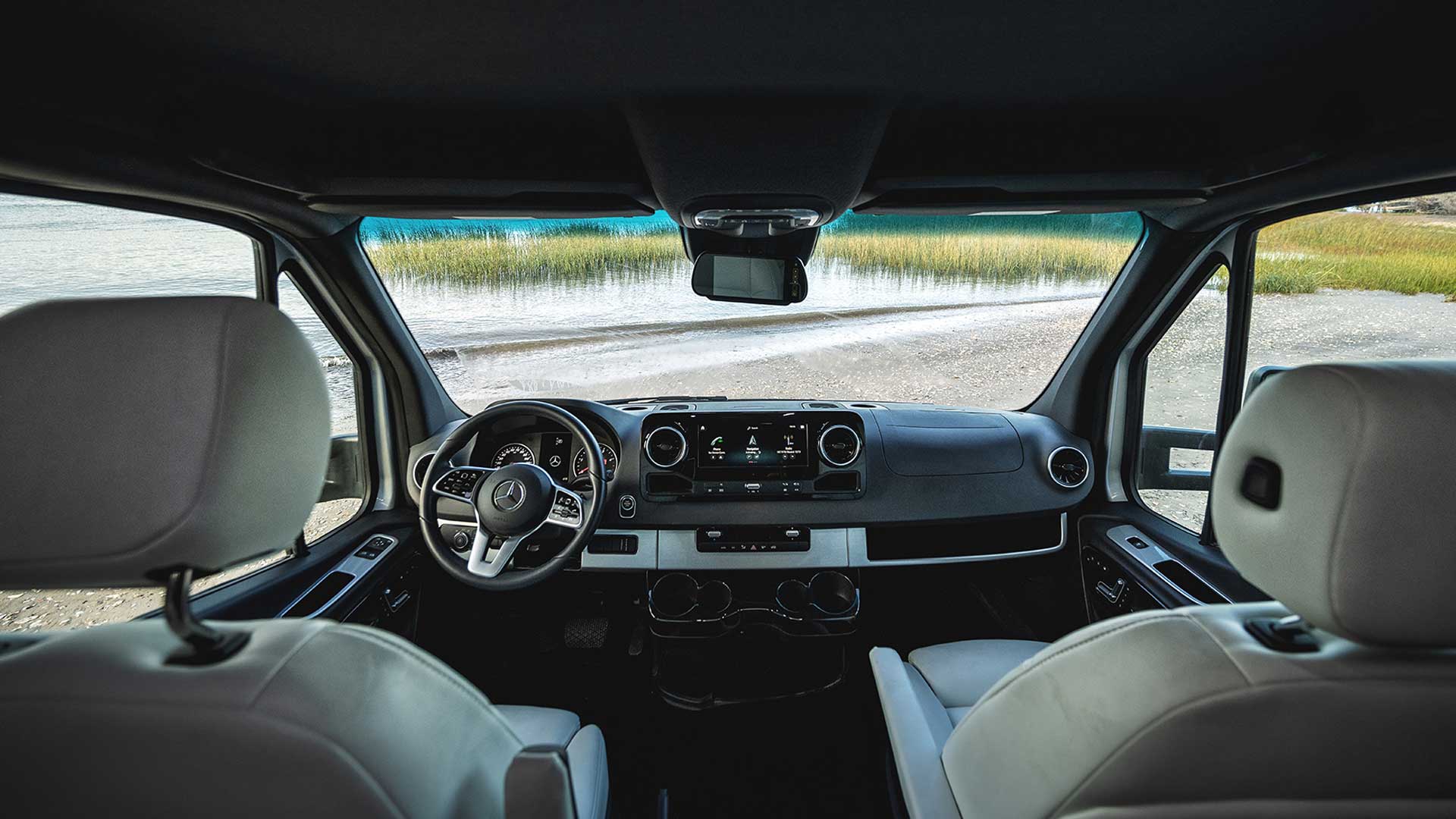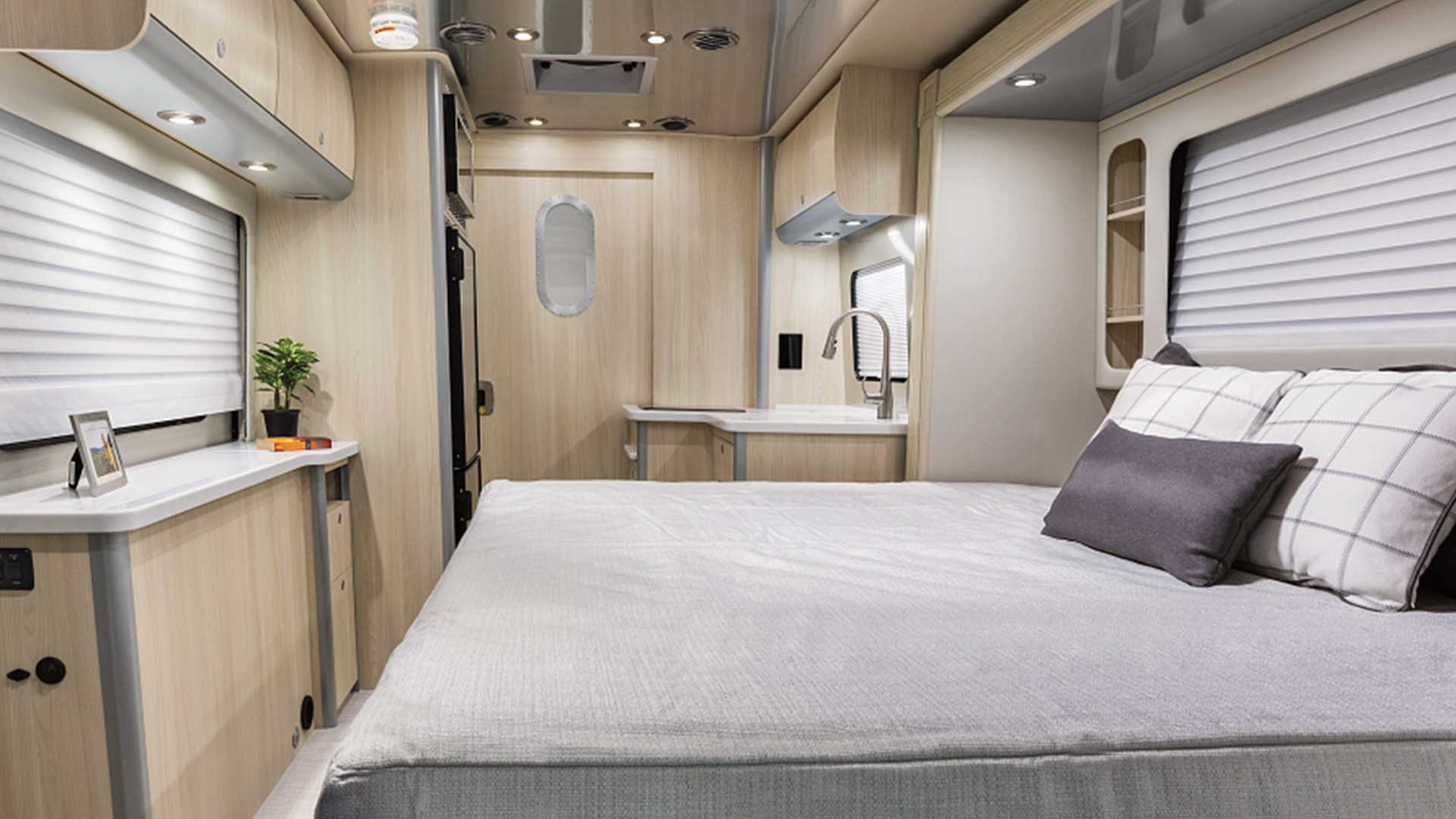 Comfort and convenience continue throughout the coach with thoughtful tech and functional touches designed for modern travel. The advanced power system with lithium batteries helps support off-grid living, while premium air ride suspension and Mercedes-Benz safety systems enhance your time on the road. Additional amenities include a high-end galley kitchen, powered awning, automatic entry step, dedicated camera monitor, and climate control that keeps the interior quiet and comfortable. With upscale interior decor options and features that make life on the road effortless, the Atlas 25MS sets a new standard for luxury touring coaches.