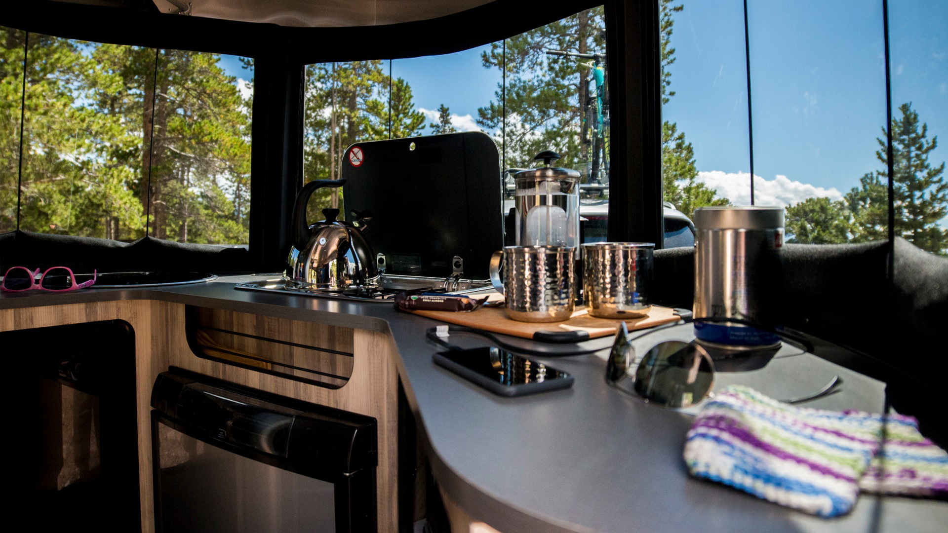 Basecamp is full of thoughtful, efficient RV features that help you fuel up for the day, then clean up and sack out when it’s all said and done. From the on-board restroom to the convertible living space that forms a relaxing bed, it’s all right there with you, along for the ride. Charge your phone, wake up and make coffee, and then hit the trails again. When you’re setting up camp somewhere hot, the optional air conditioning with two-speed fan will keep you cool. When you’re surrounded by snow, the onboard furnace and hot water heater system(s) will warm things up. Two benches and a seat that spans the inside of the rear hatch door make room for five people to lounge, eat, and hang out. And when you’re ready to get some rest, the benches become a bed for two that covers the whole back of the trailer.