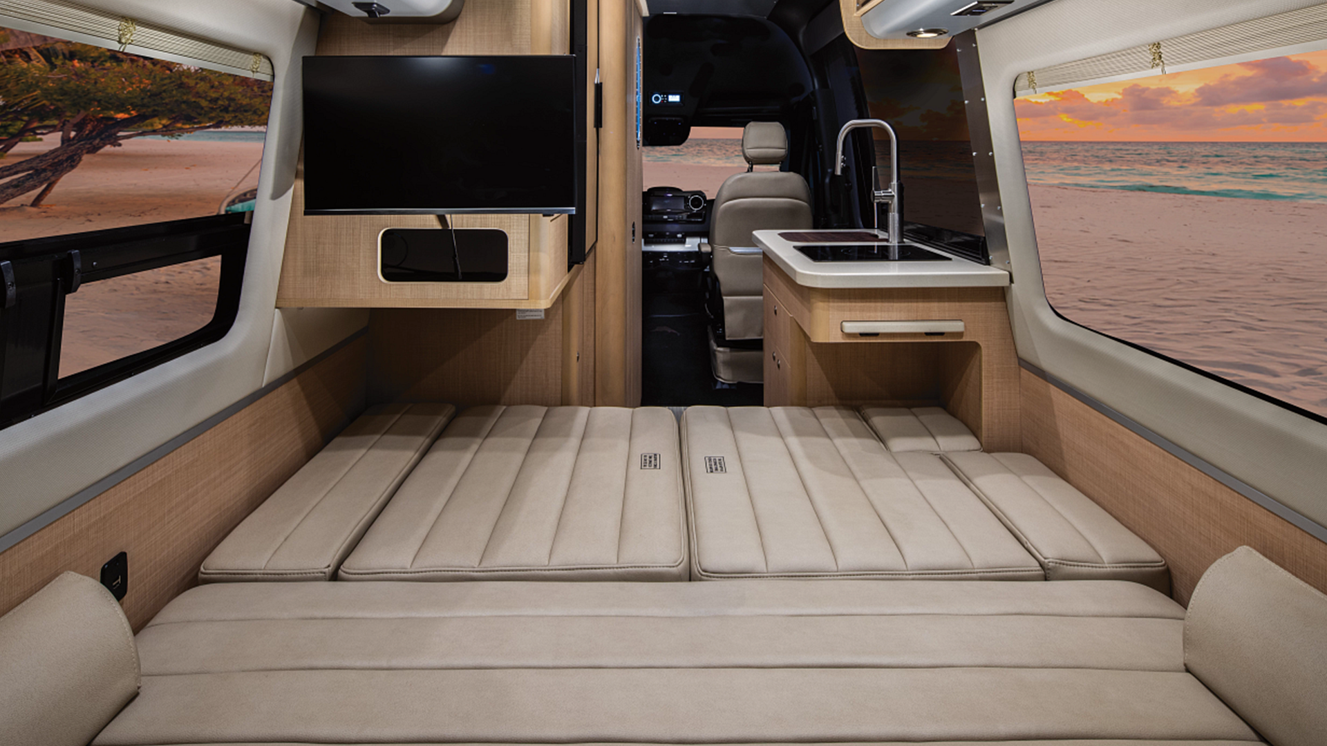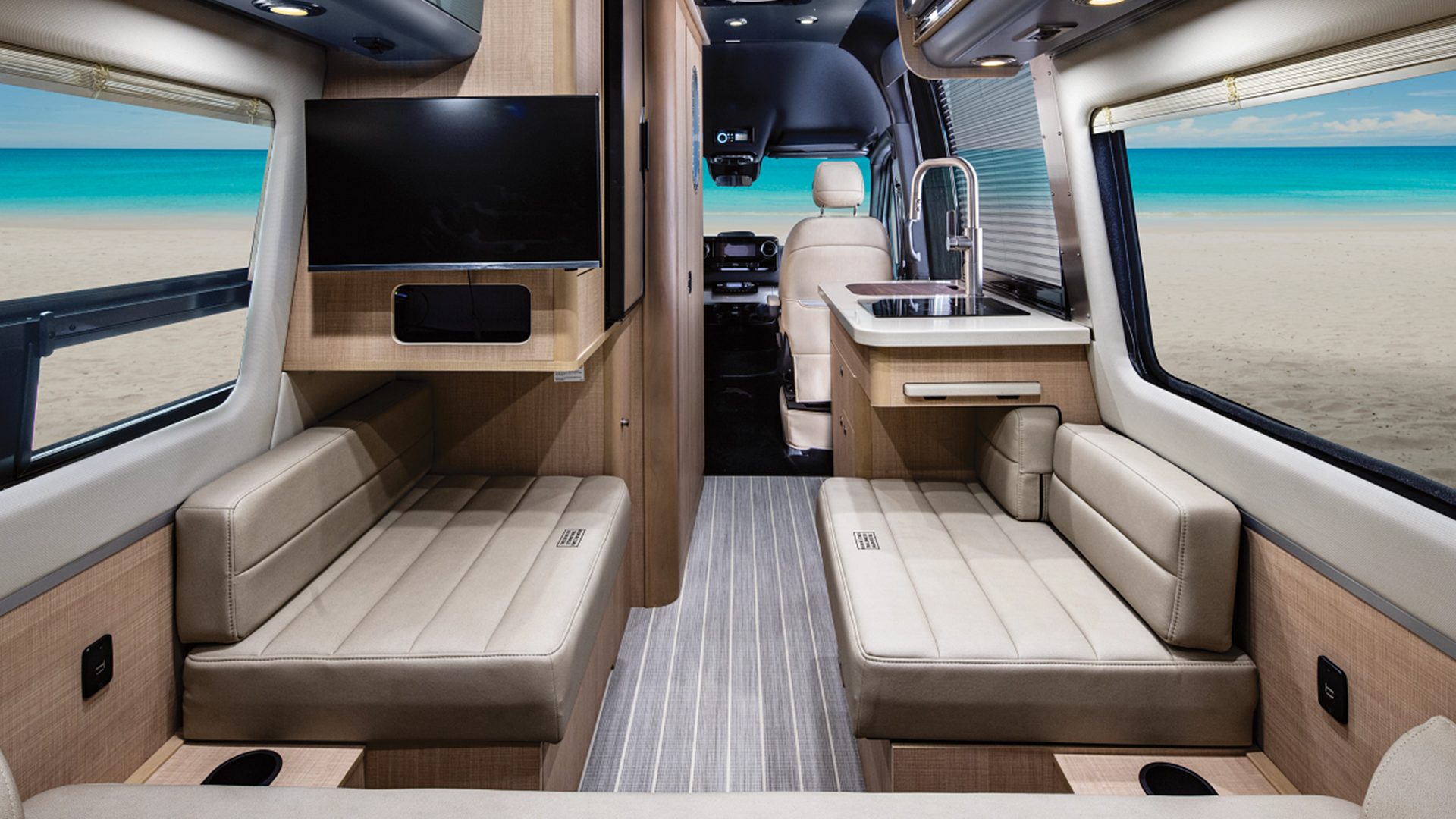 The Resort Edition lineup includes both the Atlas and Interstate touring coaches, giving travelers the freedom to choose the right fit for their lifestyle. The Atlas offers the most space with its slide-out Murphy Suite and a spacious rear bath, making it feel like a luxury condo on wheels. The Interstate 24GL is perfect for groups, offering seating for up to nine passengers, while the 24GT focuses on couples or solo adventurers who want comfort and efficiency. For those who prefer a nimble footprint, the Interstate 19GT packs in all the essentials with the same tropical touches and upscale feel.