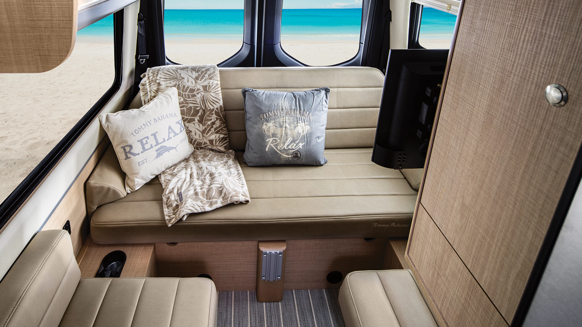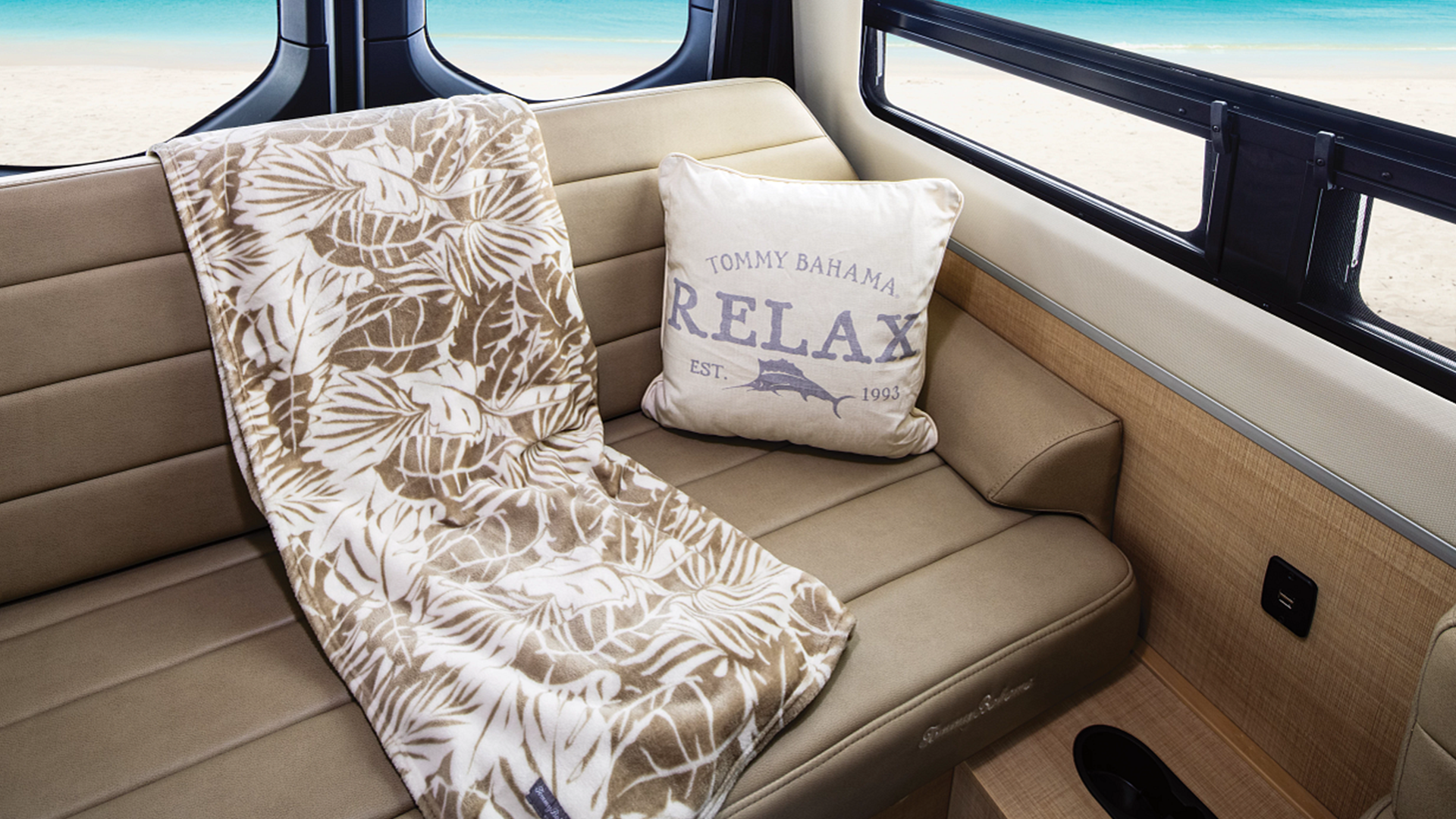Inside, the Resort Edition stands apart with its light, airy interiors featuring soft blues, warm neutrals, and tropical-inspired graphics. Exclusive upholstery stitching, matte-finish appliances, and elegant cabinetry enhance the upscale look. Each model includes the Tommy Bahama Accessory Kit, complete with items like a teak shower mat, fleece throws, pillows, glassware, and barware—all designed to bring the resort lifestyle with you on the road. In the Interstate models, you’ll also find a built-in bar cabinet, the perfect spot for storing your favorite drinks and entertaining in style.