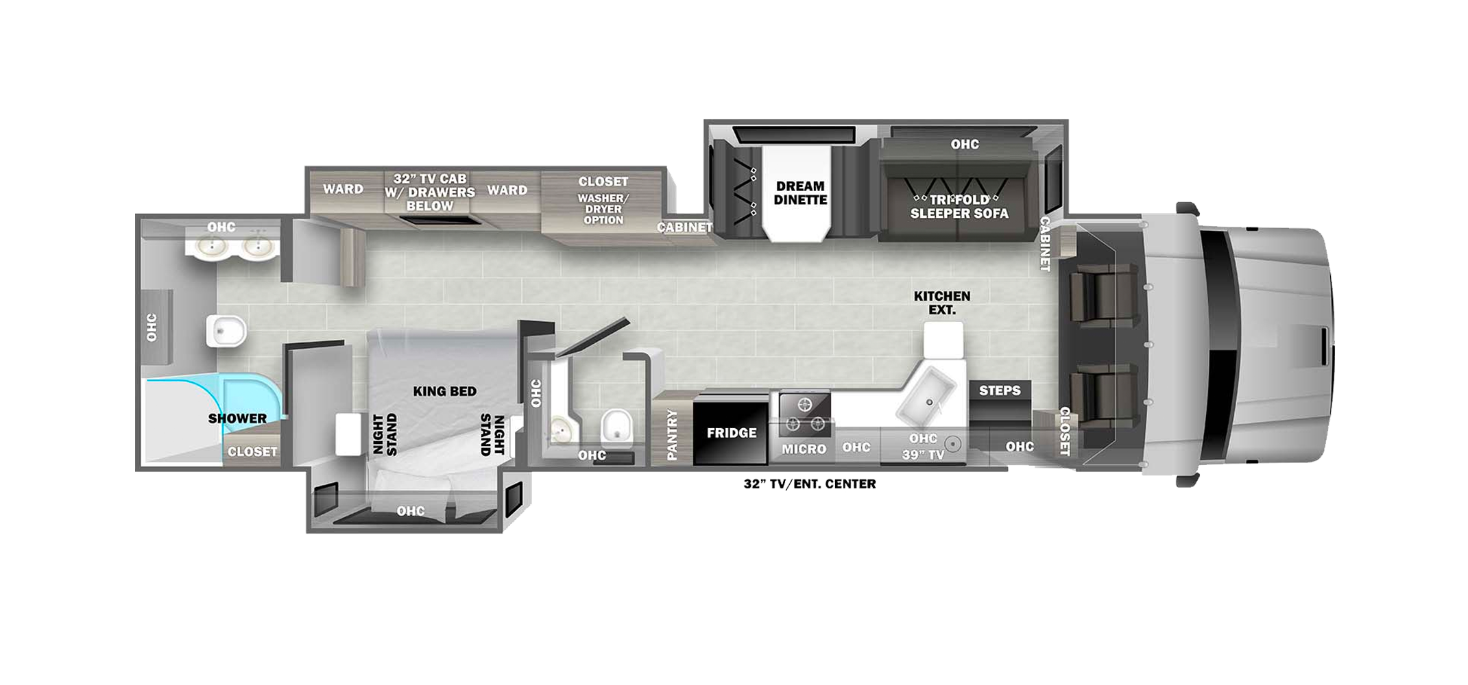 For some, the journey is as important as the destination. With Freightliner's M-2 powerhouse, the DX3 offers excellent horsepower, torque, and towing capacity.The well appointed DX3 kitchen is equipped with hardwood cabinets and stylish raised panel doors, a contemporary glass tile backsplash, solid surface countertops and a solid surface sink. Preparing meals while traveling becomes a simple task with the stylish three-burner LP cooktop, over-the-range convection microwave, and residential stainless steel refrigerator with an ice maker.All DX3 bedrooms are tastefully appointed with rich hardwoods, a 32” TV, sound bar, and Blu-Ray DVD player.What’s a home away from home without ample closet space? Wardrobe space abounds with his and her (or all her’s) closets and a multitude of drawers. An optional washer/dryer sits behind louvered doors.