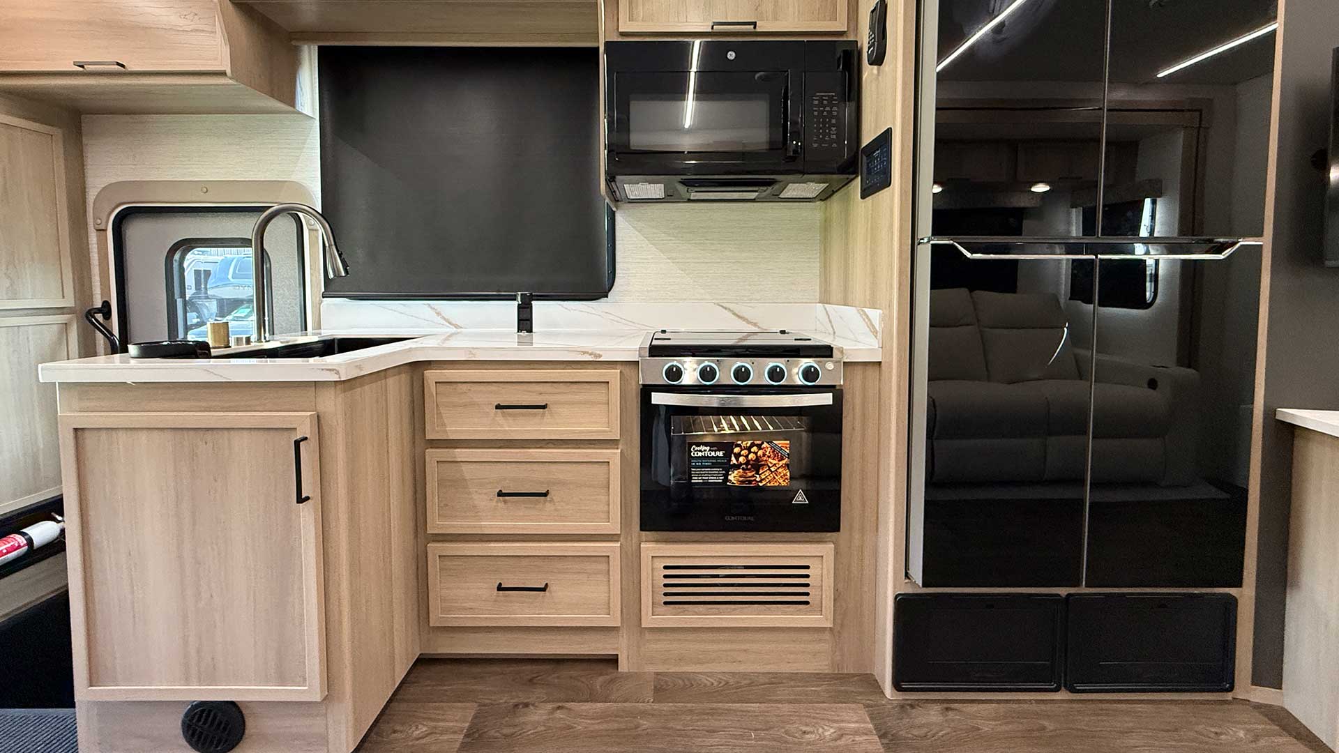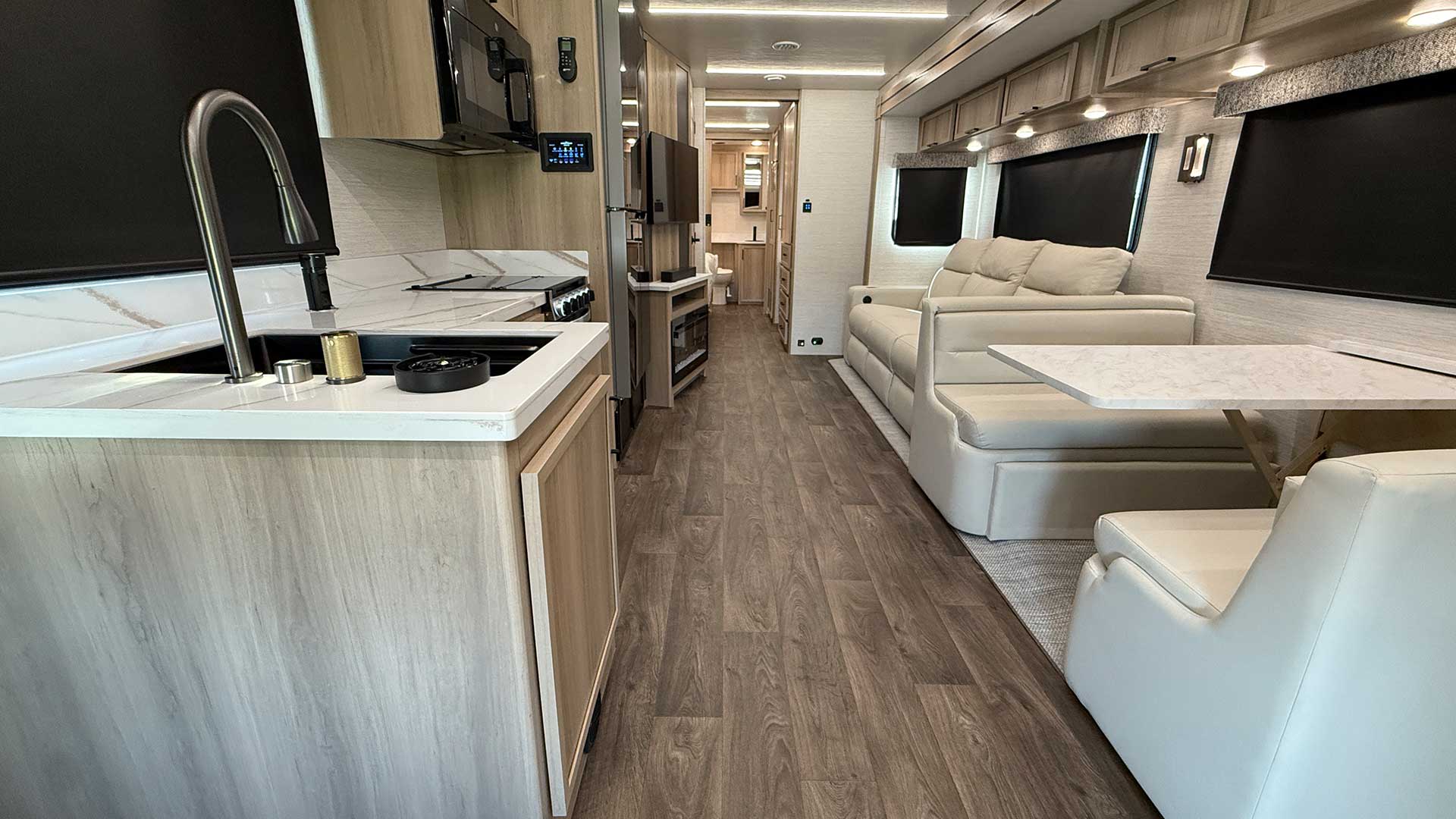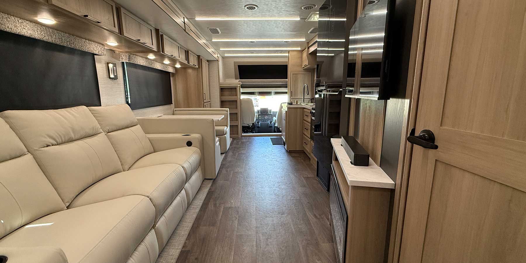 Inside, the Europa S delivers residential comfort and modern technology throughout its spacious interior. Highlights include solid surface countertops, a residential refrigerator, premium seating with heat and massage, king-size bed options, and multiple LED TVs. Advanced systems like a touchscreen multiplex control panel, solar prep, hybrid inverter, quiet dual ducted air conditioning, and premium entertainment make this luxury motorhome ideal for buyers seeking top-tier Super C diesel motorhome features and dependable off-grid capability.