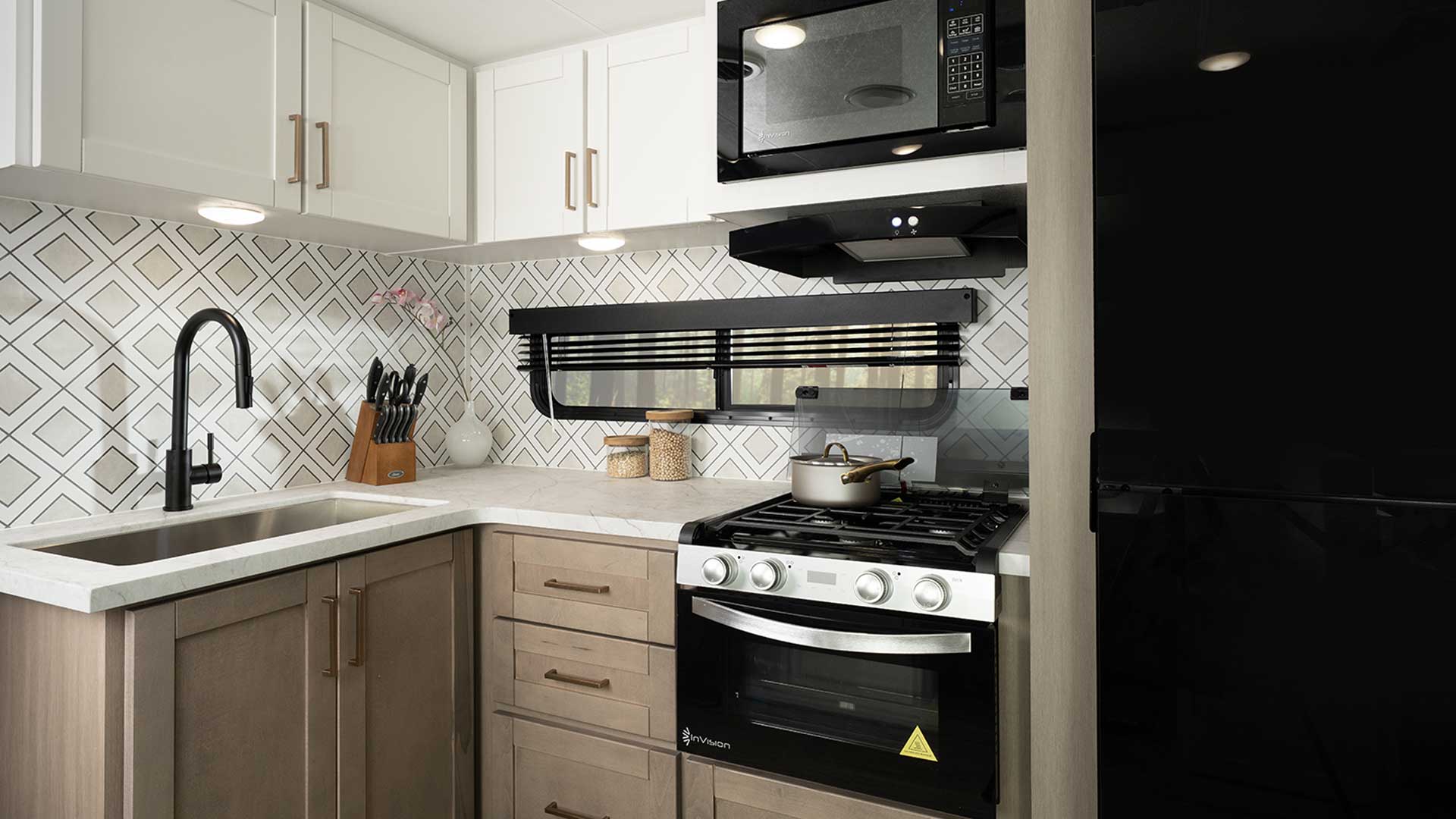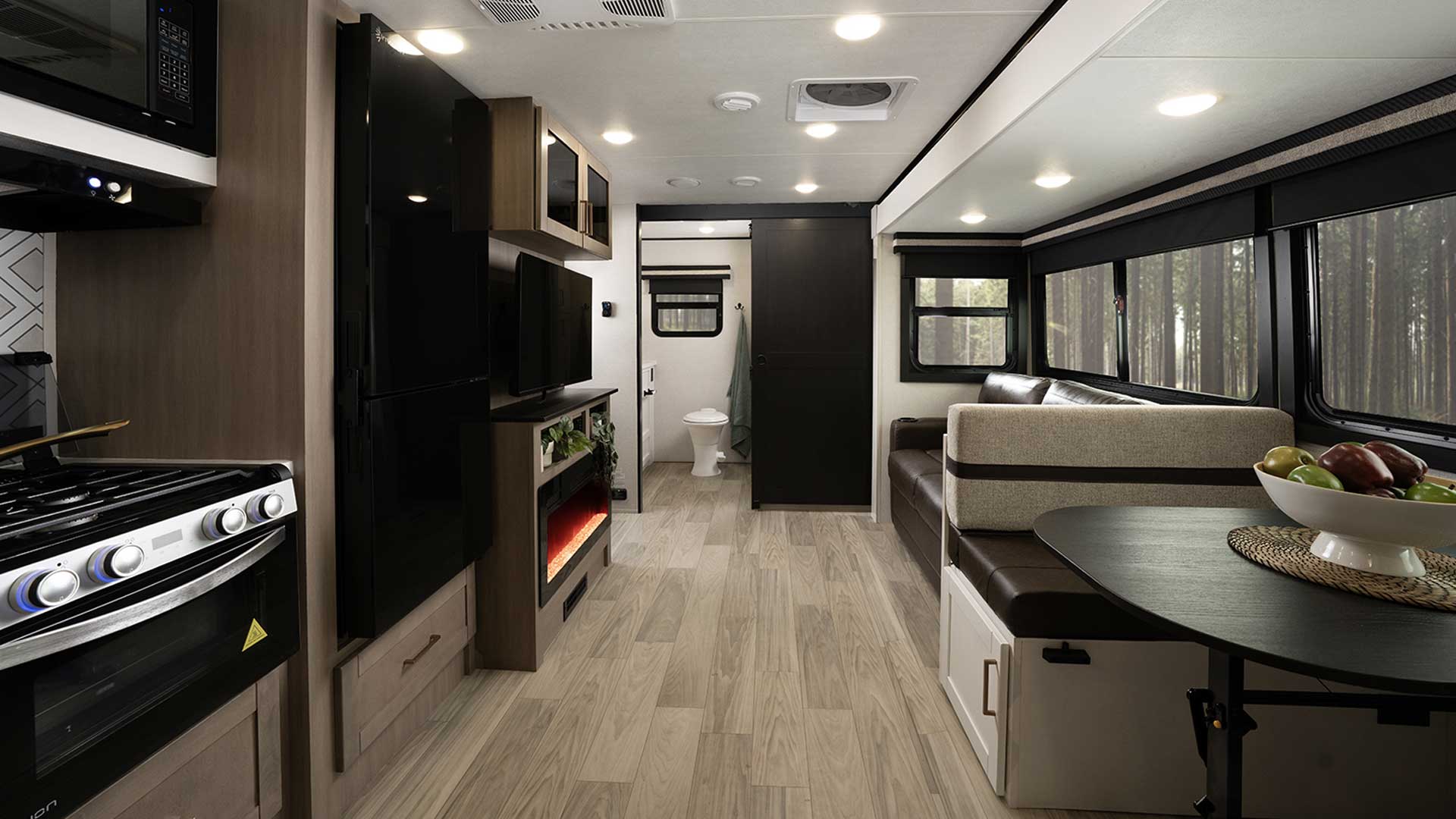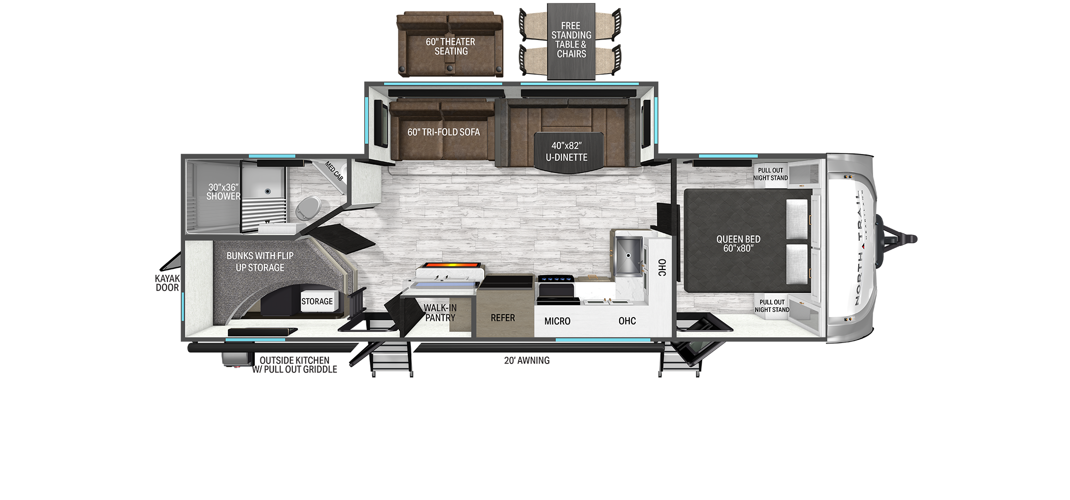 Inside, the open concept layouts feel bright and spacious thanks to high ceilings and oversized windows that flood the interior with natural light. Modern farmhouse styling pairs nicely with seamless countertops, stainless steel appliances, a deep farmhouse sink, and a residential size refrigerator. Many floor plans include a standard king size bed, along with thoughtful touches like ducted A/C, all season insulation, smart HDTVs, and Bluetooth audio. Massive pass through storage, a power awning with LED lighting, and available options like outdoor kitchens, slide outs, and solar prep make the North Trail Ultra Lite lineup a versatile and comfortable choice for both weekend escapes and extended road trips.