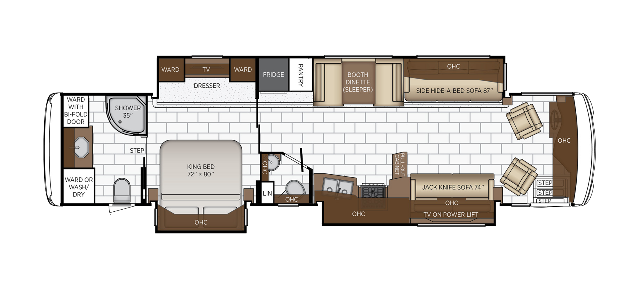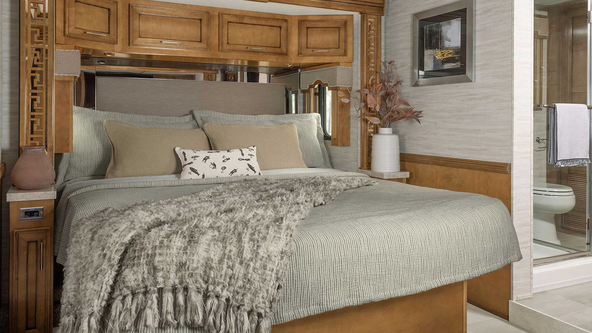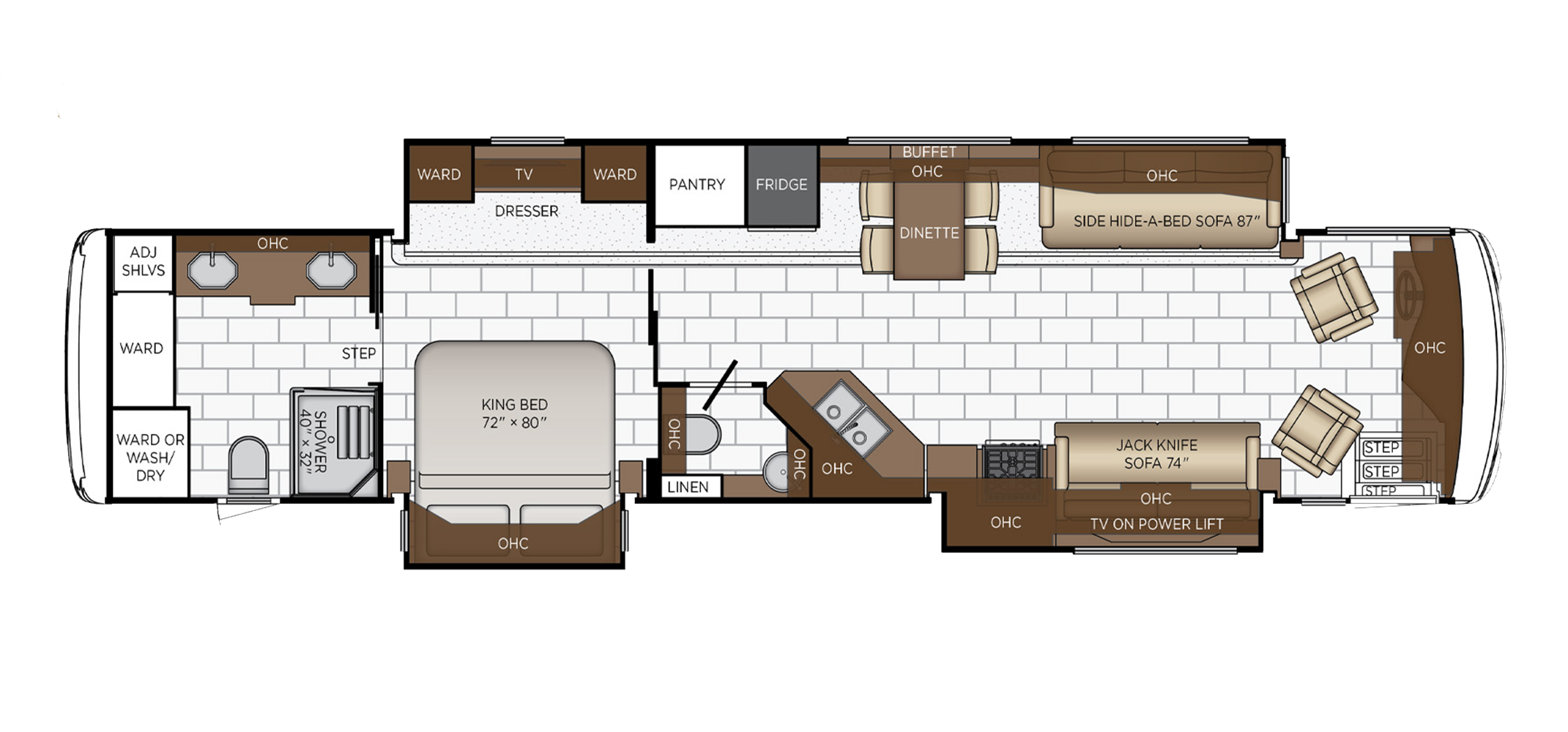 Available on a Freightliner® XCR or Spartan® K2 chassis, it packs a Cummins “B” diesel engine with 360 horsepower and 800 lb./ft. of torque in 34- and 37-foot floor plans. For 40- and 43-foot models, a Freightliner® XCR Tag Axle or Spartan® K2 Tag Axle chassis comes with a Cummins “L” diesel engine with 400 horsepower and 1250 lb./ft. of torque.