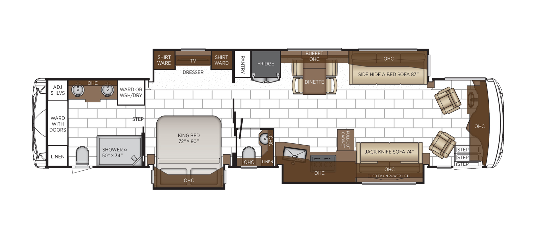 Comfort is paramount in the Ventana, with dual-zone climate control, plush seating, and a master suite designed for relaxation. The spacious bathroom layouts include glass-enclosed showers and high-end fixtures, while the bedroom features a king-size bed, wardrobe storage, and optional stacked washer/dryer.