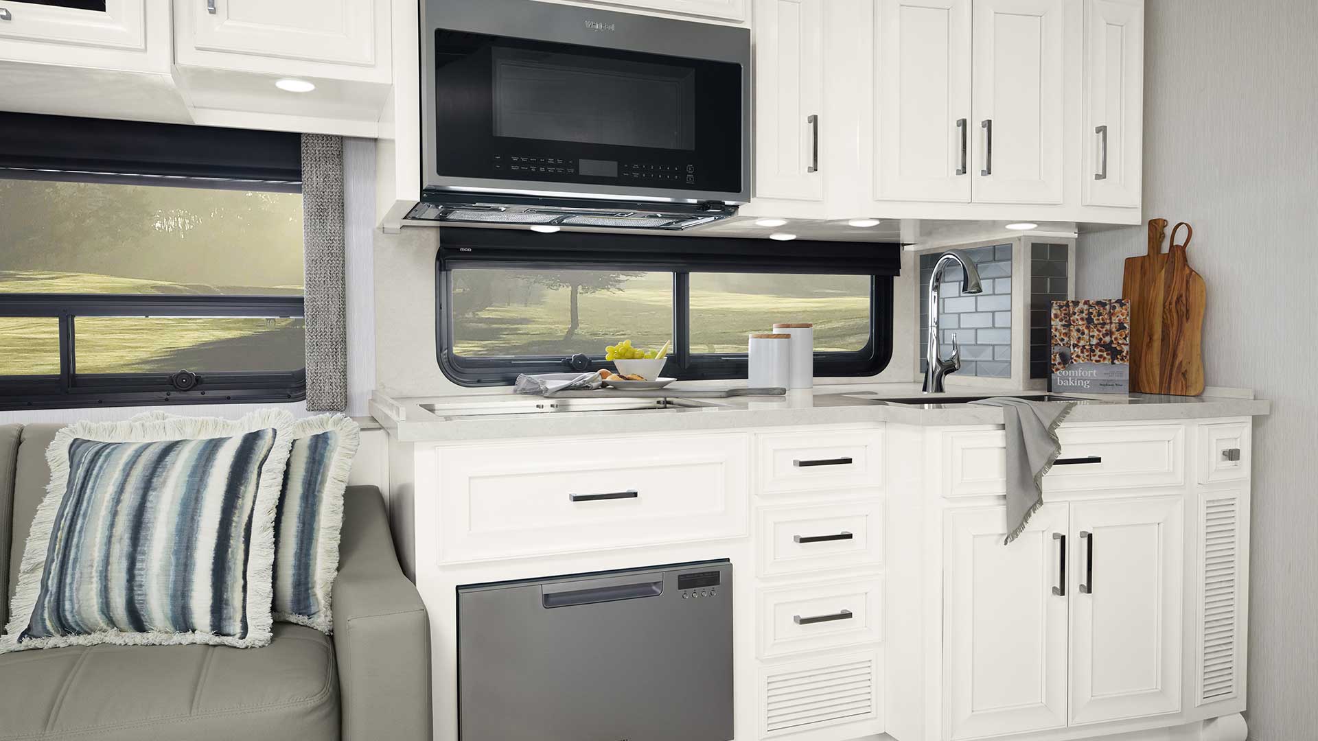 Technology is seamlessly integrated throughout the coach. A digital instrument panel, GPS navigation, Wi-Fi connectivity, multiple LED TVs, and the latest sound systems make the Ventana as smart as it is stylish. Add in plenty of under-coach storage, slide-out trays, and a power awning with wind sensors, and you'll find the 2026 Ventana is ready for life on the road without compromise.
