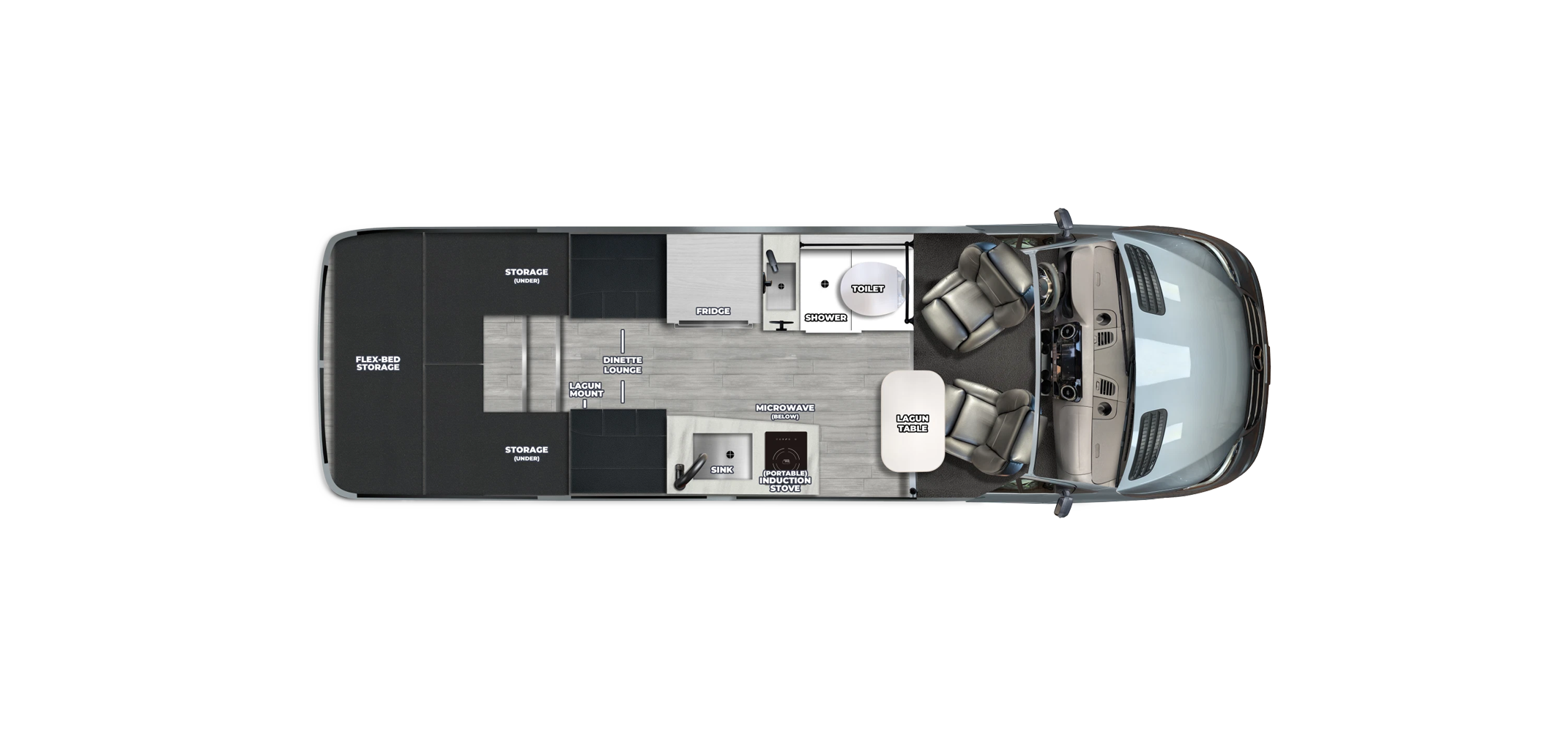 The FL features dual living spaces with a rear power sofa and front lounge ideal for working or relaxing, while the TS keeps an open feel with a rear sofa bed and smooth flow throughout the cabin. The TW caters to travelers who prefer separate sleeping areas that convert into a king size bed with generous storage underneath. The Plateau RB adds a raised twin bed design that flips up to reveal a massive rear gear garage, making it perfect for travelers who want serious storage without sacrificing sleeping comfort. All models include Corian countertops, handcrafted cabinetry, Ultraleather upholstery, a fully equipped galley, enclosed wet bath, and advanced systems like lithium batteries, solar power, Truma water heating, and touchscreen controls for a truly refined Class B experience.