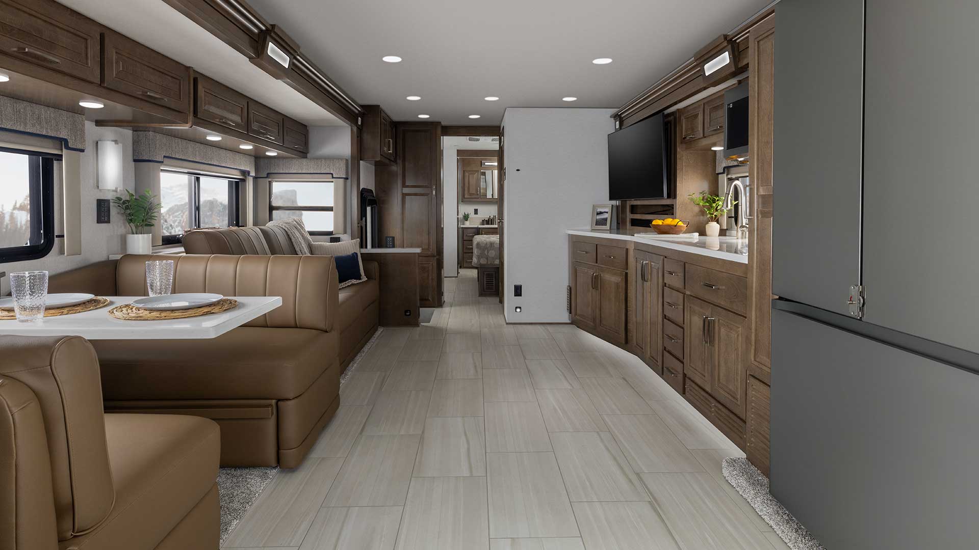 A beautiful interior includes tile floors and hardwood residential style cabinets. The ultra soft touch vinyl furniture upholstery brings on-the-road luxury you never knew existed. Your beautiful kitchen features a stainless steel French door refrigerator and a recessed 2-burner electric induction cooktop. Your solid surface bedroom dresser, full length wardrobe and dresser drawers give you plenty of space for all of your clothes.