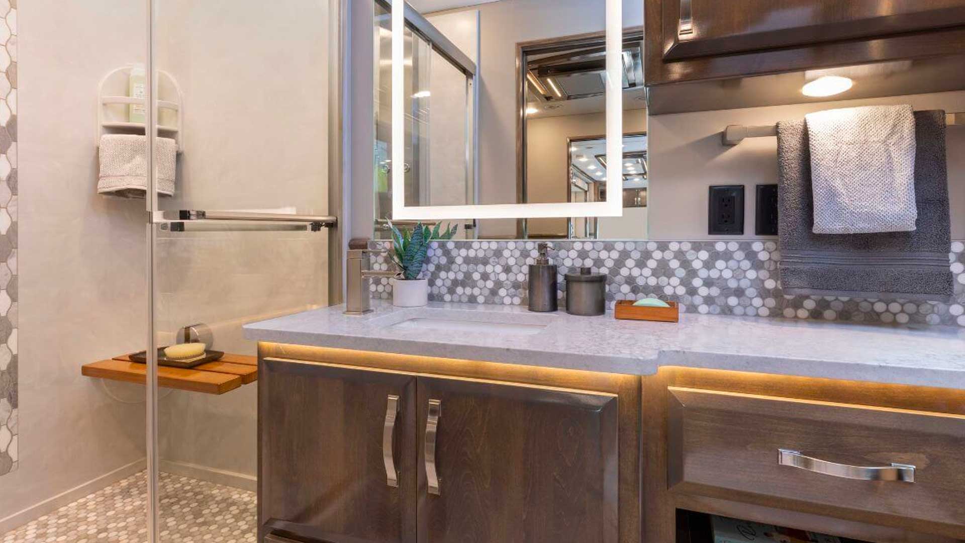 The kitchen in the 2023 IKON is a chef's dream. It boasts high-end appliances, including a top-of-the-line stove, oven, microwave, and refrigerator, allowing you to prepare gourmet meals on the road. The cabinetry offers abundant storage space for all your cooking essentials and pantry items, making it easy to bring along your favorite ingredients wherever you go.