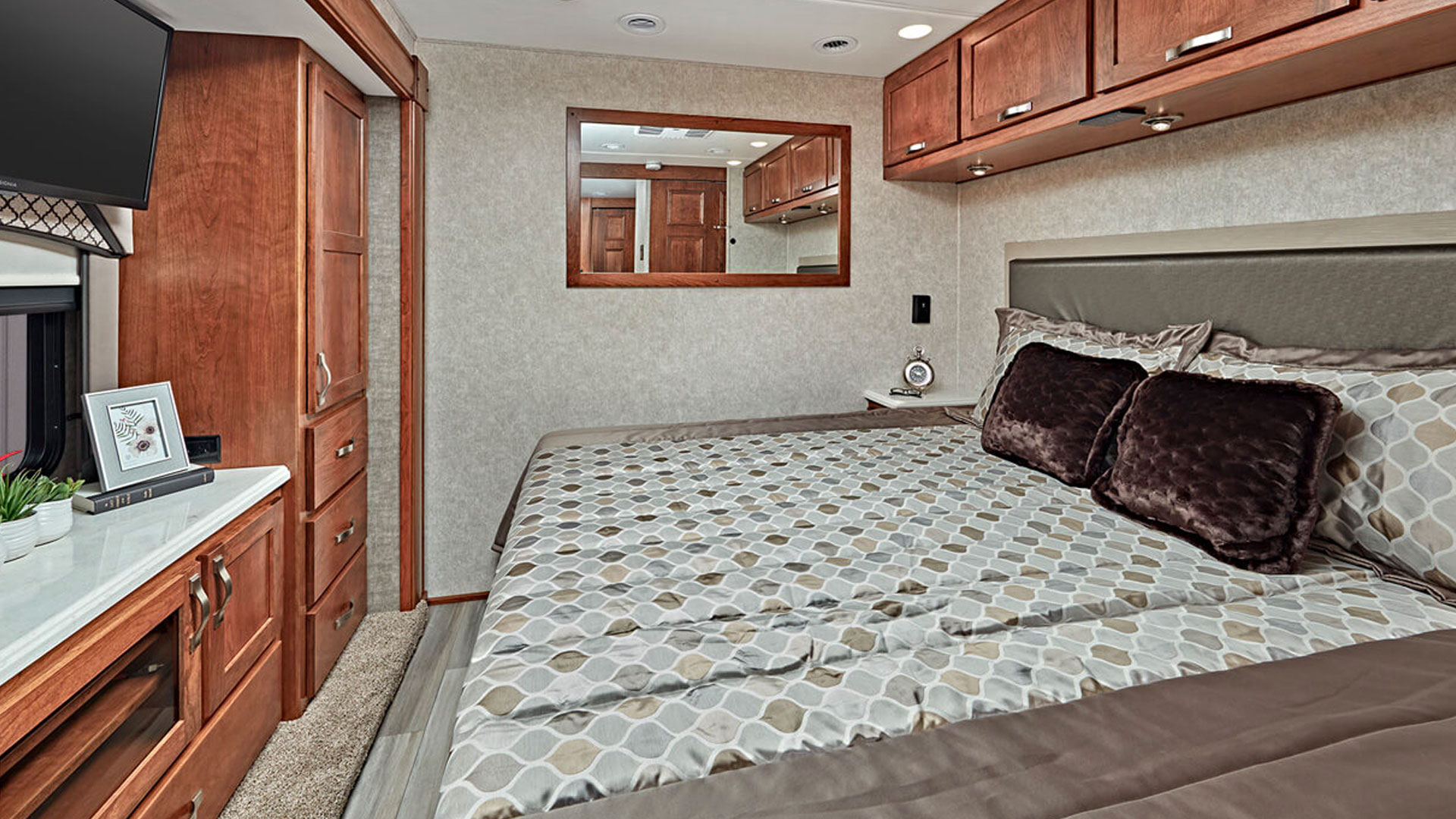 The Valencia motorhome is offered in four unique floor plans with thoughtfully designed interiors crafted to make the most of your journey. Whether you prefer a spacious master suite, bunk beds for the family or the armless awning for outside time, Valencia is ideal for your next trip. And because comfort should never be sacrificed for power, the Cummins engine produces 360 horsepower and 800 lb. ft. of torque, while the Freightliner S2RV chassis smoothes the journey with standard air ride cab seats complete with adjustable armrests and air ride rear suspension.