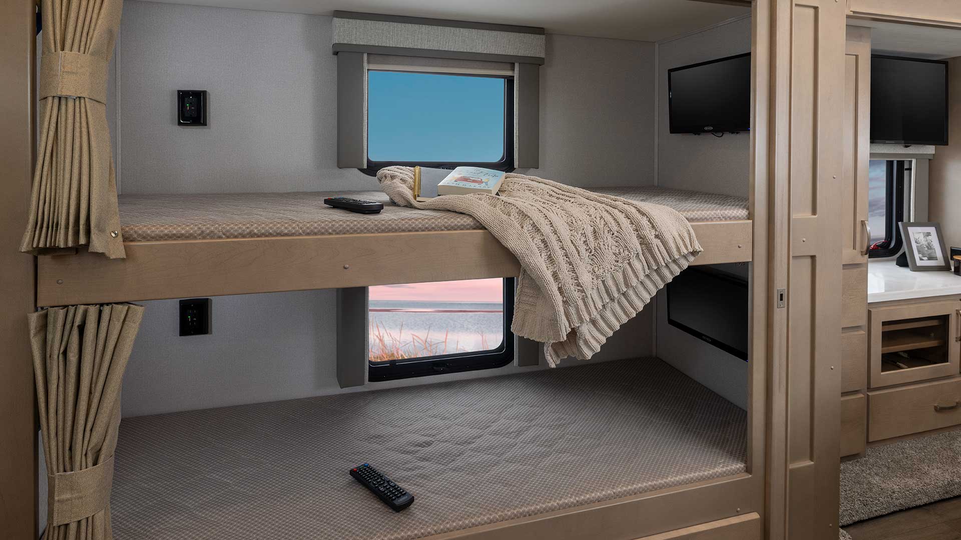 You'll feel at home with solid hardwood cabinets, solid surface countertops and glass tile backsplash. The Valencia comes with a 54" x 80" bunk space above the motorhome cab. The kitchen comes with a 3-burner stainless steel LP cooktop and stainless steel convection microwave oven. The master bedroom includes a comfortable memory foam mattress.