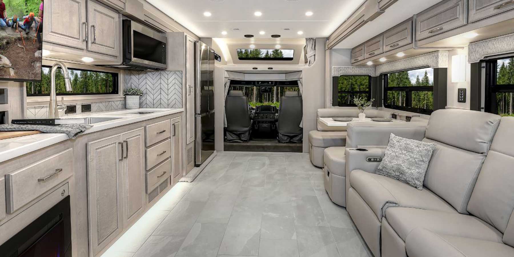 Step inside to experience a coach that feels more like a high-end condo on wheels. Upscale materials like polished solid-surface countertops, hand-crafted hardwood cabinetry, tile backsplashes, and premium furnishings create a warm, modern atmosphere. Thoughtful floorplans maximize every inch of living space, with cozy lounges, residential kitchens, and spacious bedrooms that offer true relaxation at the end of the day.