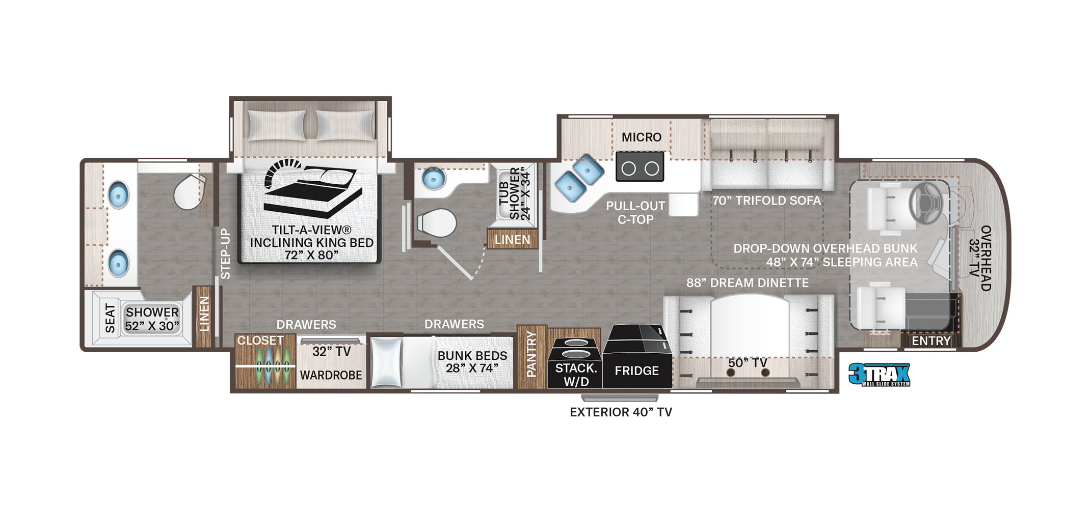 In the bedroom, there’s a Denver Mattress® King-size Tilt-A-View® bed. USB ports in the nightstands are conveniently placed to charge smart devices. Large wardrobes in the master bedroom are ideal for full-timers who pack for every season. Every model has a stackable washer and dryer for laundry on the road. Choose the perfect angle of your Tilt-A-View bed and unwind with a favorite movie. Regardless of your floor plan, you’ll love waking up in your Aria.